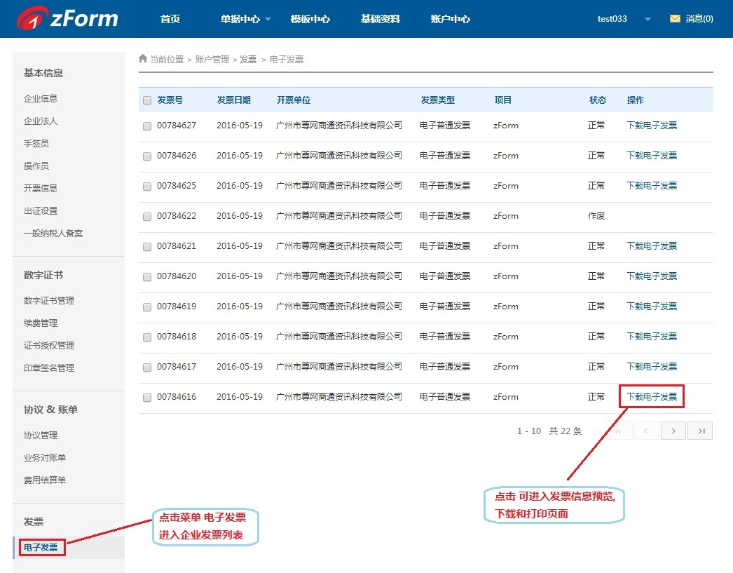 (1) 点击系统菜单 发票 -> 电子发票 查看企业的相关发票列表