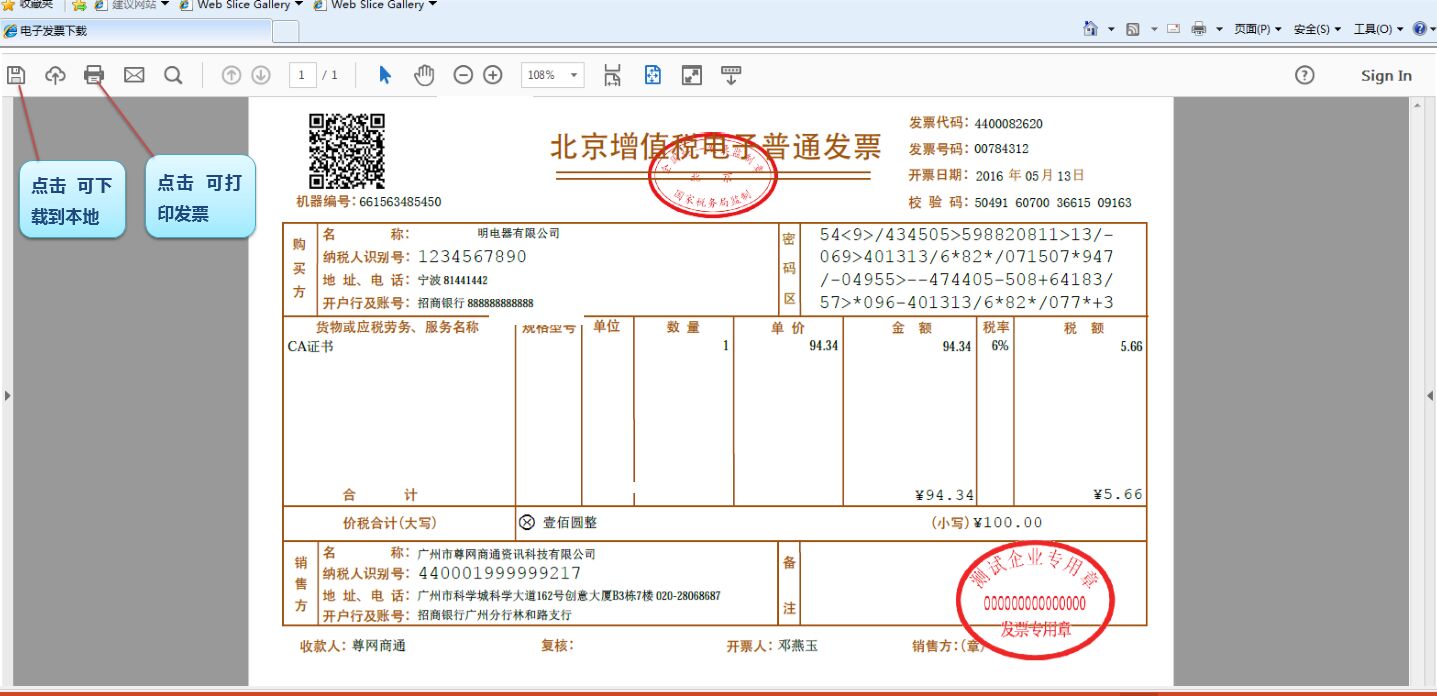 (2) 列表的发票信息 点击 -> 下载电子发票 通过浏览器开启新页面,并可预览发票的相关信息,保存和直接打印发票