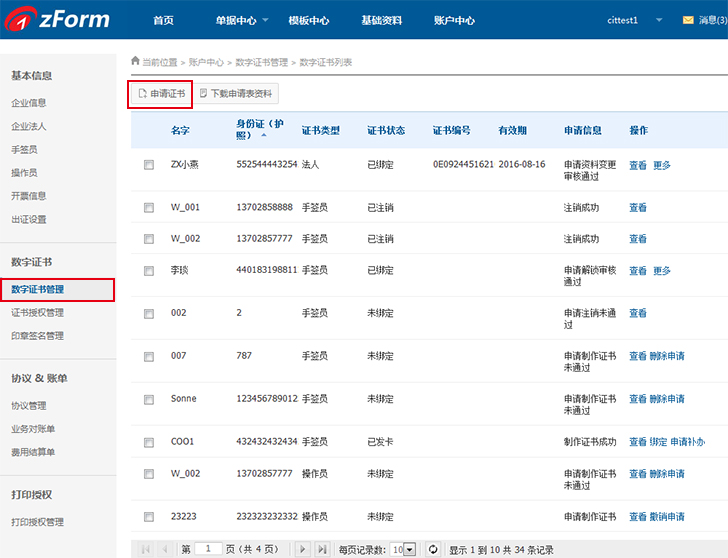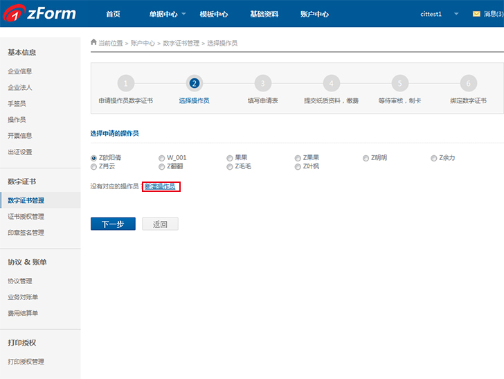 数字证书管理(企业法人数字证书、手签员数字证书、操作员数字证书)