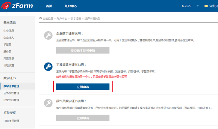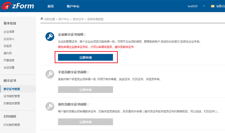 b) 选择"操作员数字证书"→点击"立即申请"。每个操作员都必须申请数字证书,已被手签员绑定的,则无需另外申请(操作员证书在手签员证书对其授权后,可以发送、打印证书)