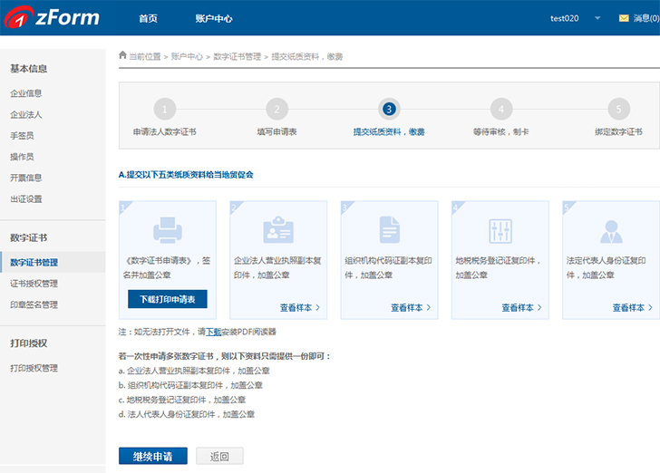 e) 下载、打印申请表,签名并加盖公章→复印相关文件并盖公章→提交给当地贸促会→等待审核(审核通过后,签收数字证书并绑定使用)。