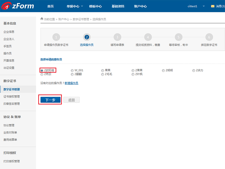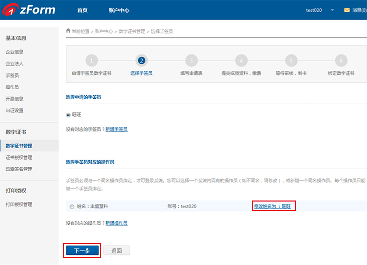 方法一:系统原有的手签员申请手签员数字证书,勾选该手签员的名字→点击"下一步"。