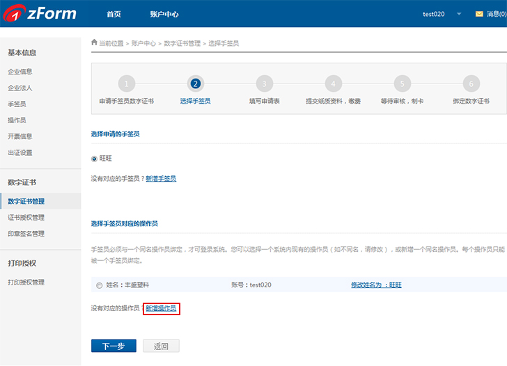 c) 选择手签员对应的操作员(手签员数字证书必须选择一个对应的操作员,且姓名与手签员姓名相同,才可以登录系统)