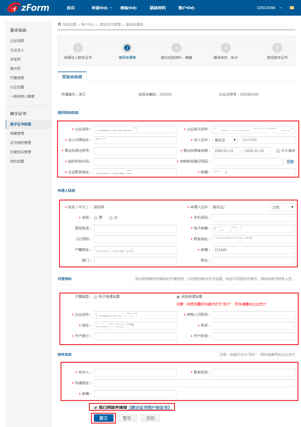 c) 填写申请表组织机构信息、申请人信息、开票资料、收件信息→“提交”