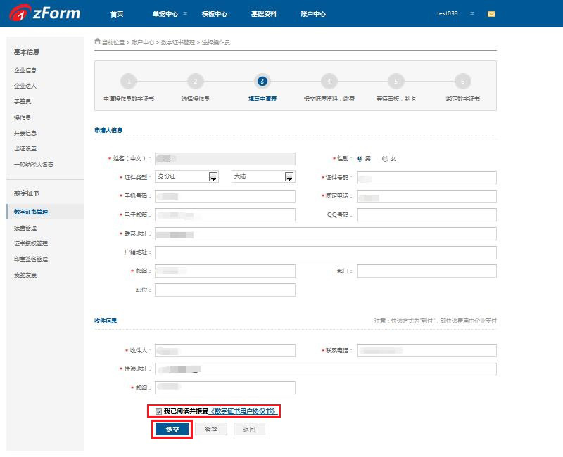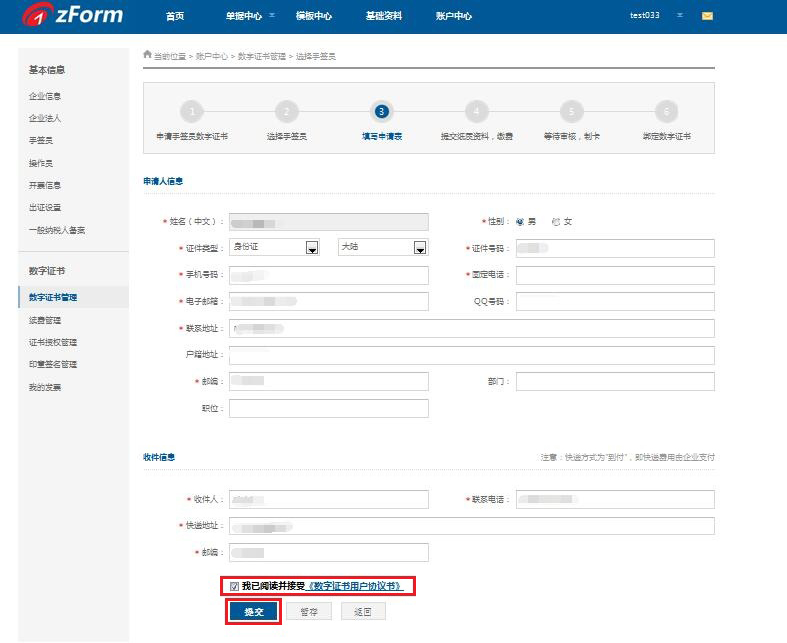 d) 填写申请人信息→收件信息→勾选"我已阅读并接受《数字证书用户协议书》→点击"提交"。