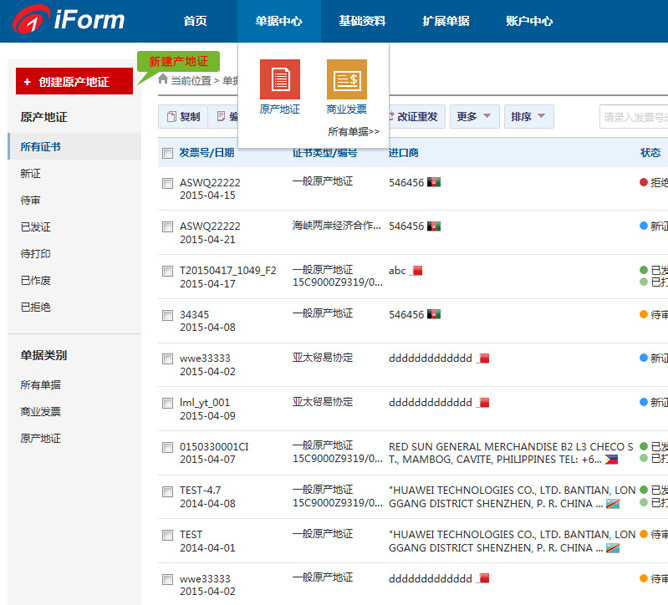 1、用户通过【单据中心】,点击【原产地证】进入到原产地证所有证书管理列表