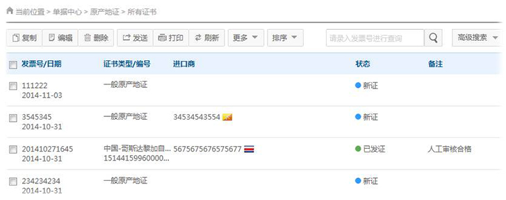 用户只需输入原产地证的发票编号、或发票编号的关键字符,点击查询即可查找出符合条件的原产地证,此功能为简易搜索功能