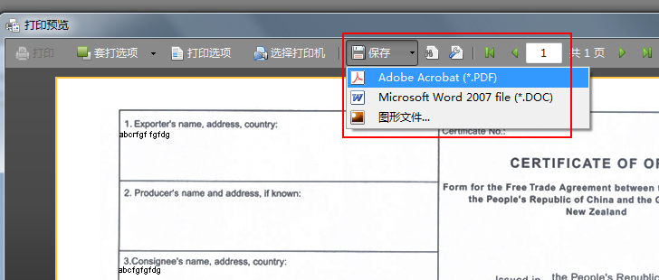 2、点击打印预览界面上方的“保存”按钮,选择需要导出的格式,即可导出产地证到电脑中,如下图: