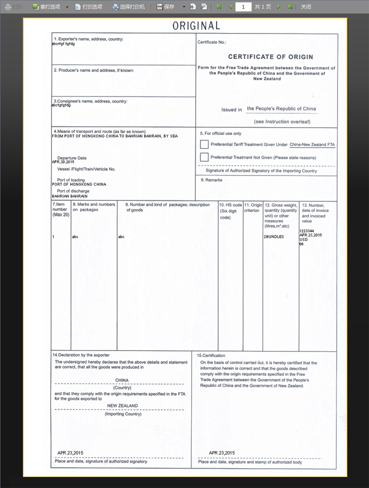 打印原产地证介绍