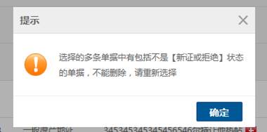 3、通过以上窗口点击【取消】按钮,关闭提示窗口,系统取消本次操作,原产地证未被删除;点击【确定】按钮,正常情况下则将所选原产地证成功删除;所选原产地证里面包含除以上3种状态以外的任意状态,则系统弹出以下提示