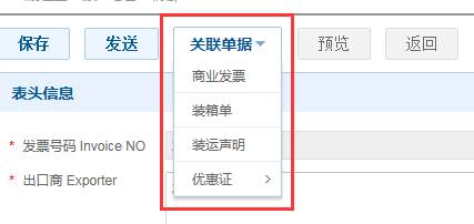 1、用户进入到原产地证的编辑界面,鼠标光标键入到编辑界面顶部功能操作区域的【关联单据】,系统展开关联单据选项,如图: