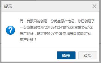 3.3、若所要关联的优惠原产地证,相同优惠区域不存在,但其他优惠区域已存在1份同被关联原产地证发票号相同的单据,则系统会出现以下提示:
