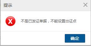 3、用户通过原产地证管理列表,选择了1份不符合以上条件的数据后,通过功能操作区域的【更多】下拉选项,单击【设置出证点】,则系统出现以下提示: